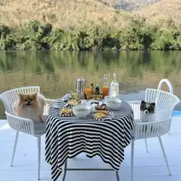 A floating raft in the middle of Srinakarin Dam, surrounded by mountain views and crystal-clear water, offers a peaceful atmosphere. There's a cafe serving aromatic coffee, homemade pastries, and main courses. Private raft rooms offer a cozy atmosphere, with activities like kayaking, swimming, and relaxing on a hammock by the water.