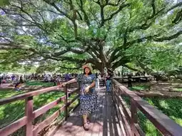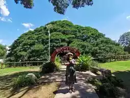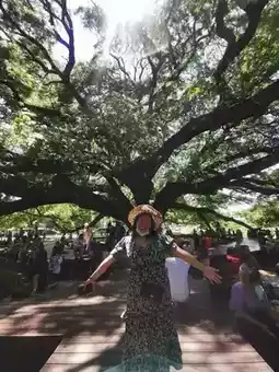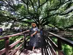 If you come to Kanchanaburi and don't visit the giant rain tree, it's like you haven't been to Kanchanaburi. Another important landmark of Kanchanaburi, which is large and more than 100 years old, has a wooden bridge in a circle around the tree to help prevent tourists from stepping on the tree's roots or scraping their luck according to beliefs. There is also a beautiful garden with flowers and ornamental plants, which is very shady and cool under the giant rain tree. However, on the day we went, there were quite a few people because it was a holiday. After walking around the garden, looking at the trees, and taking pictures for a while, we came out. Inside the area in front of the entrance to the rain tree, there is an area selling souvenirs, local products of the community, and drinking water. We bought a lot of snacks: fresh spring rolls, meatballs, other fruits, sweet and delicious coconut water that was cold and awesome. There are also many parking spots. If you pass by, stop by and visit.