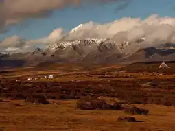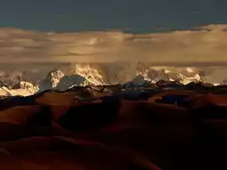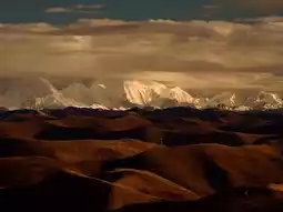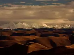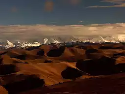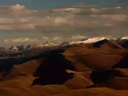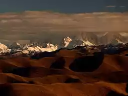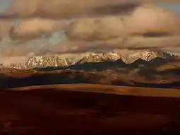 During autumn (2024), the autumn color of vegetation in the valleys and the rolling mountains were strongly enhanced in red coloration by the evening sun. Shadows of the rolling mountains, and direct sunshine of the setting sun shining onto the side of the snow mountains at the east horizon, enhanced the photography effects of the panorama.