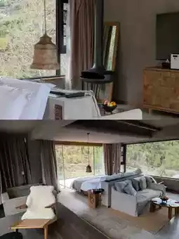 A blend of Tibetan and wabi-sabi styles, relax by the floor-to-ceiling windows with views of rolling mountains. At night, stargaze and dance Guozhuang—everything is just perfect.