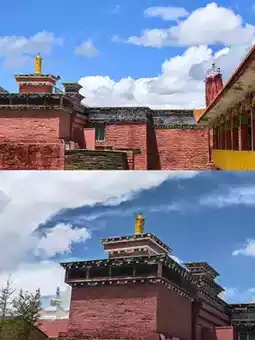 1. Muya Jinta Main Structure: Tickets generally cost around 10-15 yuan. This mandala-style Buddhist temple building has three floors. The first floor is the Exoteric Hall, housing statues of Shakyamuni Buddha, Avalokiteshvara, Manjushri, and other eight great bodhisattvas and eighteen arhats; the second floor is the Esoteric Hall, enshrining Padmasambhava and esoteric lineage masters; the third floor is the Buddha's Relic Stupa, containing the Tripitaka, five types of relics, and hidden treasures. The three floors represent the Three Jewels of Buddha, Dharma, and Sangha, and the three vehicles of Great, Small, and Esoteric Buddhism. The outer eaves of the stupa are decorated with gilded ornaments such as golden deer, dragon heads, golden-winged birds, and treasure banners, shining brilliantly under the sunlight.