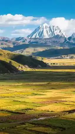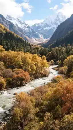 Snow-capped mountains, colorful forests covering the hills, golden grasslands,