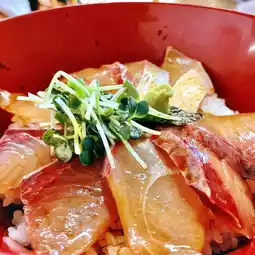 The amberjack rice bowl is served with Kyushu's sweet soy sauce