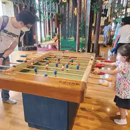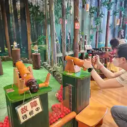 All the facilities in the Muyu Forest are made of wood, with exquisite workmanship and are very fun. In addition to larger ones like swings, wooden horses, suspension bridges, etc., there are also many small games that bring back childhood memories, such as shooting rubbers, bouncing frogs, football machines... Even my husband was very involved in the game.