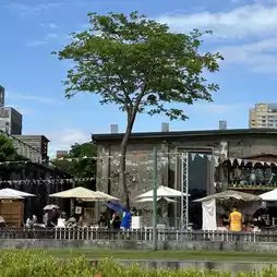 Several large warehouses accommodate different stores. There are people selling wood products, various local cultural and creative products, as well as coffee shops and restaurants.