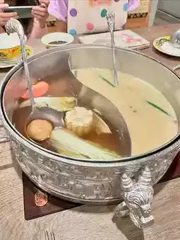 The hot pot ingredients are not very diverse, but the ancient-style tableware and environment are quite unique. The most special items are the 'gong' and 'jue' used to serve the 'lychee ice vinegar,' which look exactly like those in Chinese history books—very distinctive!
