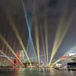 The combination of modern architecture and artistic installations enhances the beauty of the harbor. The reflections on the water add depth and movement to the scene, making it a photographer's paradise. The interplay of lights highlights the wharf’s dynamic energy, drawing people to stroll along the promenade.