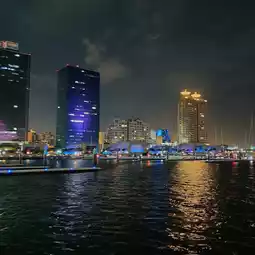 As night falls, the waterfront transforms into a vibrant display of colors, illuminating the skyline and creating a magical atmosphere.