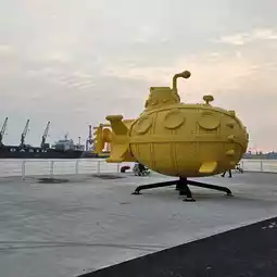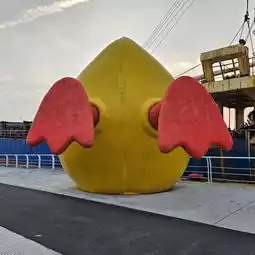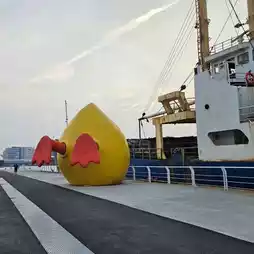 The yellow duck's upside-down tail is very cute. It is within walking distance from the light rail's Guang Rong Pier and the Tourist Center Station.