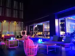 The hotel's exterior features a soft blue design, creating a unique architectural style with flowing light and water effects. The rooftop pool bar offers a strong ambiance, giving a modern and vibrant feel that reflects the enthusiasm of Kaohsiung.