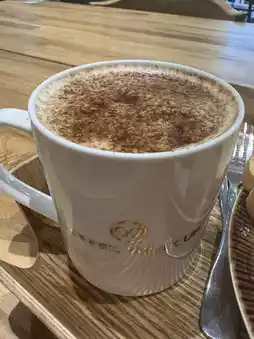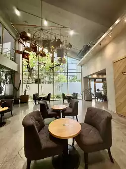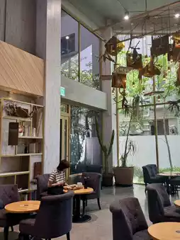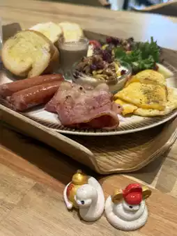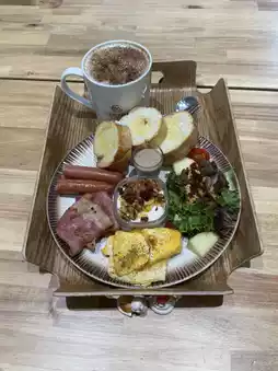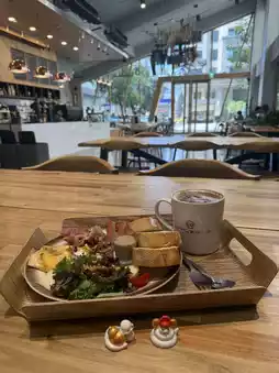 The environment is beautiful, with high ceilings that make you feel happy and comfortable. It's my favorite breakfast place. This morning, I visited (Coffee Awakening) again and ordered a (Classic Breakfast) set. It includes German sausage, two slices of ham, salad, dried fruit yogurt, and three pieces of toast. A rich and delicious meal that's also very nutritious. I also ordered a cup of brown sugar milk. A delightful breakfast. Even when dining alone, it's important to eat well.