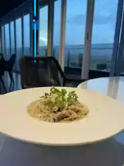 We ordered three dishes: creamy wild mushroom pasta, black truffle and porcini risotto, or a carpaccio appetizer (depending on the menu), and truffle fries. The pasta had a springy texture, and the sauce was light yet fragrant. The carpaccio appetizer featured balsamic and baby sprouts, the acidity brightening the fat. The truffle fries had photogenic, sharp corners, and a sprinkle of Parmesan for a crispy texture. This table wasn't overly ostentatious, but perfectly captured the rhythm of "viewing the view + chatting."