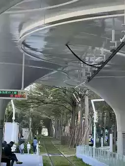 Finally, back at the light rail station, the white curved roof reflects the shadows of the trees and the train. This scene creates a modern blend of "green, white, and silver," making it especially clean for portraits.