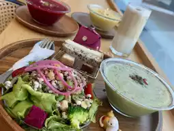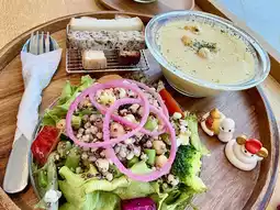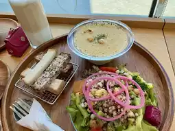 Today I went to SO_UP, a light food restaurant inside the Neiwei Art Center in Gushan District, Kaohsiung. It's perfect for a weekend stroll or a movie. The all-white design of the Neiwei Art Center is also perfect for photo ops! SOUP serves brunch from 8:00 AM to 5:00 PM. The staff are young, attractive, and friendly. I ordered a set menu with two soups. (Very Sponge Gourd Soup) Sponge Gourd, onion, shimeji mushrooms, and white fungus. (Corn, Rice, and Wheat Soup) Corn, oat milk, onion, carrot, garlic sprouts, and vegetable broth. (Beetroot and Apple Soup) Beetroot, apple, onion, tomato, eggplant, and celery. All very healthy. I finished three bowls of soup by myself. My favorites: the yellow (corn) for its texture, the green (sponge gourd) for its aroma, and the red (beetroot) for its nutrition. This is a great vegetarian restaurant and highly recommended.