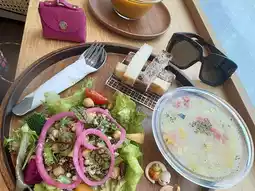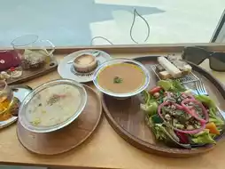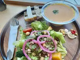 Their set menus are centered around soup, salad, and gluten-free bread, with seven varieties in total. Each soup has a unique flavor, making it delicious and nutritious! It's a great choice for diabetics and a pet-friendly restaurant. This is my second time at SOUP for breakfast. I take the Kaohsiung Light Rail, which is convenient, and get off at the Neiwei Art Center station. The restaurant opens at 8 a.m. and was very happy to have breakfast there. I rotated through the six main soups. Last time I tried three, but today I tried new flavors (pumpkin broth) and (mixed wild vegetable soup) and ordered a piece of cheesecake. The food was beautiful and tasty. 😋 The staff were young, attractive, and friendly! Highly recommended.