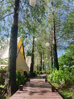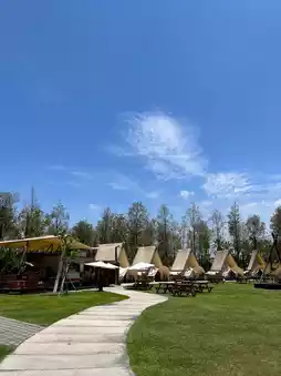 Jingyuan Farm is also a mini zoo where you can get up close and personal with a variety of adorable animals. The farm features popular species such as capybaras, alpacas (grass mud horses), flamingos, raccoons, sika deer, and Valais blacknose sheep. Visitors can purchase feed and experience the fun of feeding them themselves, a particularly popular attraction for children. The park's landscape is inspired by Balinese Nanyang style, creating a tropical resort atmosphere. The Bald Cypress Picnic Area features a beautiful tented picnic area and comfortable beanbags, surrounded by lush bald cypress trees. Enjoy a relaxing picnic during the day and the tranquility under the twinkling lights at night, making it a popular Instagram-worthy spot. The family play area features a large sandpit, slides, swings, and other amenities, allowing children to let off steam while parents relax in the adjacent rest area.