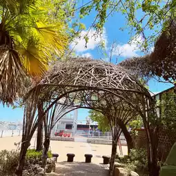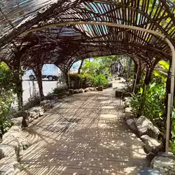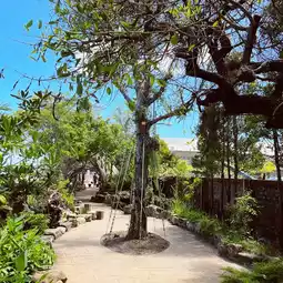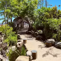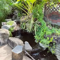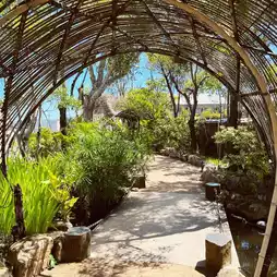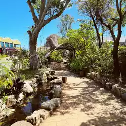 A green trail created by a bamboo cane, plants and a pond, with the theme of plant creation, is like the entrance to a natural secret. It makes people feel relaxed and comfortable, and it looks great when taking photos. Plus, there are fish and aquatic plants in the pond, right? Love the cool design that makes you feel cool