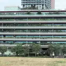 Stunning tall buildings with interesting designs next to the library