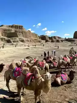 There are two routes to the Devil's City: one is to drive in, with a charge of 60 yuan per person, and you can choose your own route, and you will see various different scenes. There is a small train in the scenic area that you can take, currently there are 4 stops, each stop lasts for 10 minutes, enough for everyone to take pictures. Be sure to catch the small train, don't fall behind, the entire landform shape is very beautiful, and the photos taken are also very blockbuster. It is recommended to wear dark clothes, so the photos will look better. The first stop is where you can ride a camel, the second stop is where the film 'Seven Swords under Tianshan' was shot, there is a high viewing platform with a wide view. The third stop is a good place to watch the sunset, and it is also where 'Crouching Tiger, Hidden Dragon' was shot. The last stop is the Dinosaur Park that children like.