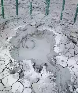 ✅There are multiple vents on the top of the mud volcano, and the mud flow that gushes out forms a conical mound on the ground. The flowing mud has a unique beauty effect.