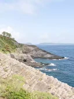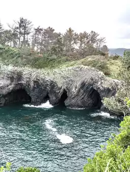 The rock surface is lined up in a regular pattern like columns, the same as Tojinbo in Fukui. The cliff has been deeply carved by erosion, and as the name suggests, there are seven caves. You can feel the magnificent power and threat of nature.