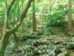 Outside the building, the forest boasts over 10,000 trees including maples, Japanese maples, and ginkgoes, accompanied by the soothing sounds of waterfalls and streams, creating a serene atmosphere โจ