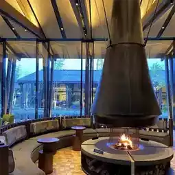 The lobby has sofas and chairs arranged around a distinctive large fireplace, and the high ceiling makes it very open 🌿