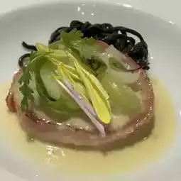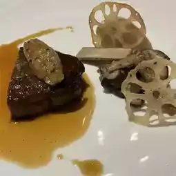 Located about a 15-minute walk straight from Karuizawa Station to Old Karuizawa. The entrance is 4-5 meters in from the gate along the street. Check-in was at the reception of a Western-style building that exudes history, and we enjoyed a welcome drink while watching the roaring fire in the fireplace. For dinner, we enjoyed an aperitif, appetizers, soup, and fish dishes, but the highlight was the main course of pan-seared domestic beef fillet with truffle-flavored onion confit. Since it was New Year's Eve, we were also served toshikoshi soba (year-crossing noodles).