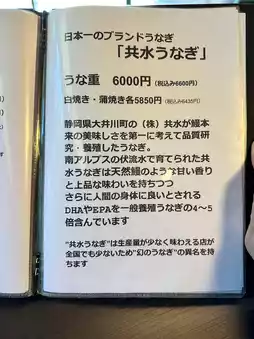 They serve the legendary brand eel "Kyousui Unagi" and "carefully selected domestic eels" including those from Lake Hamana