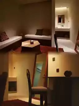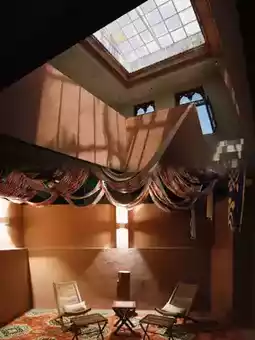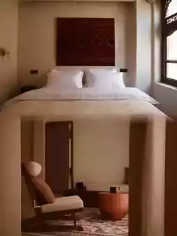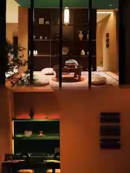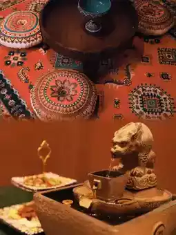 In the suite, traditional hollowed-out gypsum floral walls naturally separate the sleeping area from the tea room. The earthen kang bed is covered with handmade mulberry bark paper mats, and a rawap instrument hangs above the bed as decoration. The bathroom space cleverly incorporates modern underfloor heating, allowing the ancient "abdast" (water vessel) to coexist harmoniously with contemporary facilities.
