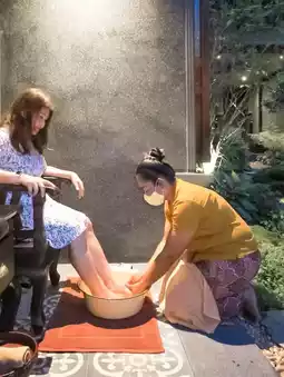 It's hot like this. Let's massage to cool down. Walked in and heard the sound of running water. It's very shady. Even when going to the massage room, you have to pass through a corridor full of trees. 🌳 It's like going to travel in the forest and follow the mountain.