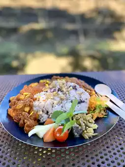 After wandering through rows of greenery and garden goods, I stopped by the on-site café for lunch. I had the tomato curry, and it was the perfect comfort meal—mildly spiced, rich in flavor, and served in a cozy greenhouse-style setting.