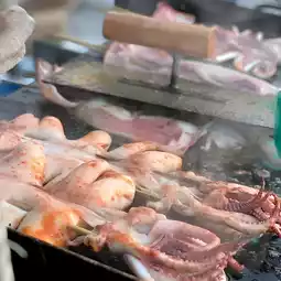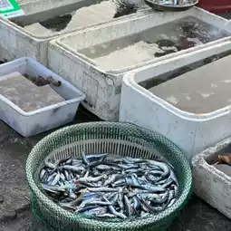 The port area is surrounded by many simple seafood snack shops. Some of them have groups of diners gathered under their awnings to enjoy the delicious food, while some shops are surrounded by a whole circle of people queuing up, and the scene is quite lively.