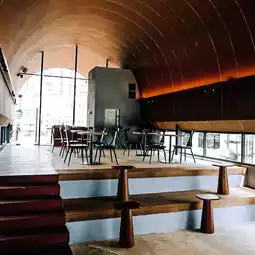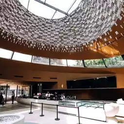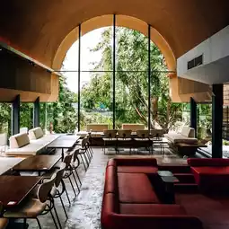 The stunning design starting from its unique façade to its beautiful minimalist interior combined with tropical vegetation around it. The seating area is very spacious, there are two indoor floors and a cozy and warm semi-outdoor area. The facilities are also quite complete, there are private meeting rooms, amphitheaters, prayer rooms, arcade games and later there will be a 3-kilometer jogging track that surrounds the lake behind it.