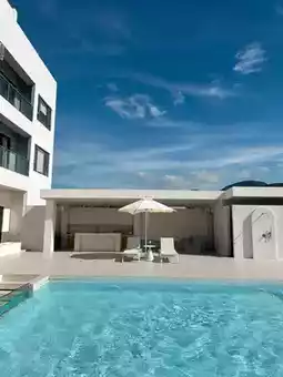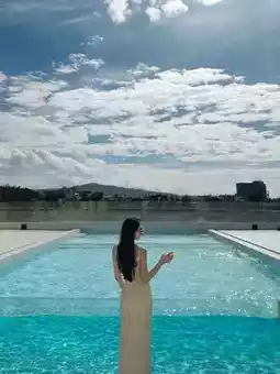 Blue sky, white clouds, warm sunshine, clear swimming pool