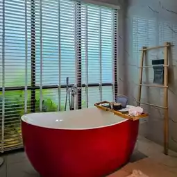 The room is divided into a bedroom zone, a bathroom zone. There is a bathtub in the room. And a living room zone That comes with a balcony in front of the room Sit and relax, watch the sea. And there is a private pool in the villa.