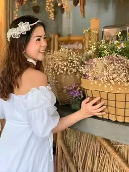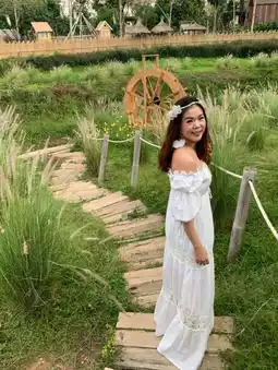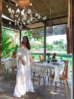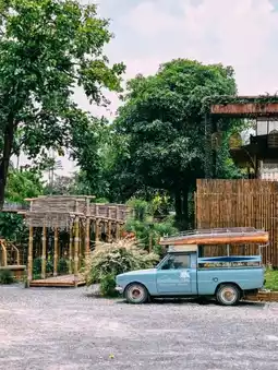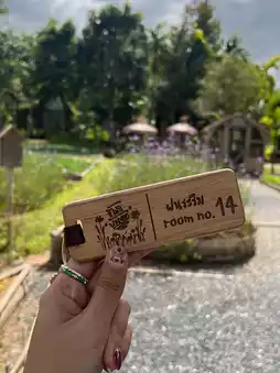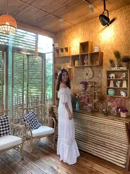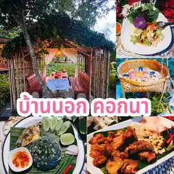 The green nature contrasts with the bright blue sky. There is a small canal with a bamboo bridge and a pier for relaxing. Various vegetable plots in the backyard allow you to enjoy pesticide-free fruits and vegetables that you grow yourself... Baan Nok Kok Na, Khao Yai, has a café that is open from 10:00 AM to 5:30 PM. It is a two-story building primarily designed with bamboo, looking simple yet stylish.