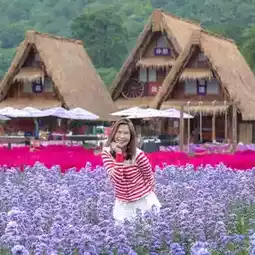 A flower garden with a Japanese-style cafe, nice atmosphere, mountain view, many kinds of flowers, many colors. This is a very beautiful flower garden. I recommend it. The flowers are all over the garden, blooming, both sweet, bright, and juicy colors. Take pictures from any angle and it's beautiful. Inside there is a cafe, there are indoor seats, you can sit and enjoy the view all day. Plus the weather is great right now.