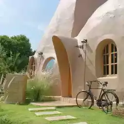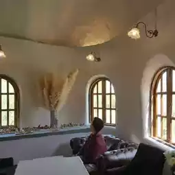 The building is designed as a "clay house" in earth tones, with a fairy tale house vibe. The curved shape makes us feel like we've escaped into a fairy tale world.