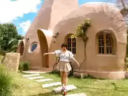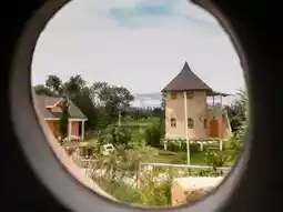 Looking through the round glass🪞, you can see the mud house contrasting with the sky. There is a pond in the middle.