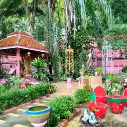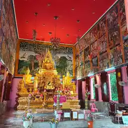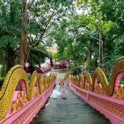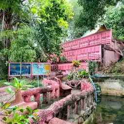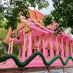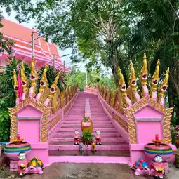 Wat Khao Thurian is located in Khao Phra Subdistrict, Mueang Nakhon Nayok District, not far from Ganesha Park. It is a temple with a unique identity: the entire temple is painted pink, whether it is the ordination hall, the temple hall, the pavilion, or the Naga stairs, which are beautifully colored and different from other temples. This is the origin of the name, Wat Chompoo. Another highlight is the bathroom, which received the award for best toilet in 2009 from the Ministry of Public Health. The ordination hall is painted pink all over and is surrounded by a glass wall with green Naga serpents around the wall. Inside, there is a principal Buddha image that looks like Phra Buddha Chinnarat. There are murals of the life story of the Lord Buddha. #VisitTemple #Worship #PlacesToVisitNearBangkok #MissingForests #NatureTherapy