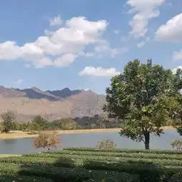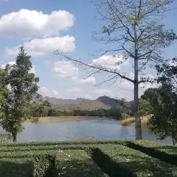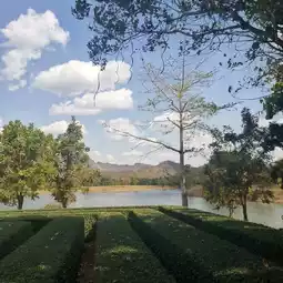 Pirom Cafe, a cafe nestled in the valley of Khao Yai, boasts a cutting-edge design surrounded by lush greenery, layered shrubs resembling tea plantations. The surrounding area is another highlight. Behind the cafe is a small pond, with a mountain backdrop, creating a stunning view. Perfect for a relaxing getaway. If you're visiting the Pak Chong-Khao Yai area, don't miss stopping by for a photo opportunity and a stylish drink. Stand and breathe in the fresh air.
