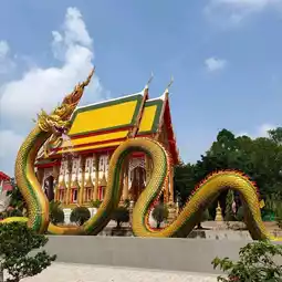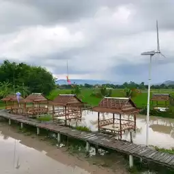The Tung Namui Bridge is located in Sarika Subdistrict, Mueang District, Nakhon Nayok Province. It is a long, winding S-shaped bamboo bridge that spans the rice fields of Uncle Od, the owner of the farm. It is over 150 meters long and has a shady atmosphere with green trees and small mountains.