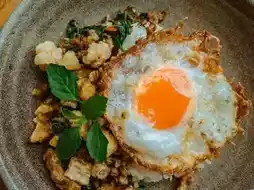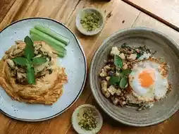 🥘Rosebay Home cooking Café, a café with a specialty of stir-fried basil. The menu here has a lot of stir-fried basil to choose from, such as stir-fried crab with basil, stir-fried pork rinds, stir-fried beef with basil, stir-fried dry, the smell is so fragrant and mouth-watering. Another highlight is the fried egg that the restaurant frys beautifully. Use a spoon to poke the egg yolk to mix with rice. Pour some chili fish sauce. Let me tell you that the taste is so awesome. In addition to stir-fried basil, they also have other rice dishes to choose from.