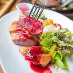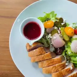 🦆 Smoked duck salad with raspberry sauce is very delicious.