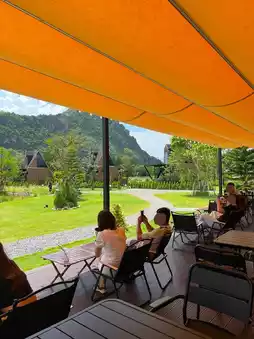 🏕️ This place is a place to stay, you can camp, and there is also a cafe. We only went to the cafe. The view is so beautiful!!! Come sit and eat snacks, chill, and see the view worth millions. It is very comfortable and relaxing. It is a good way to recharge your batteries. The cafe has outdoor seating, but the shop has fans.