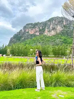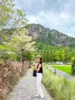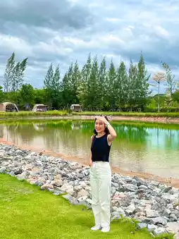 A 180° panoramic view of "Eko Mountain," featuring a pond, a grassy area, and surrounding mountains. The airy atmosphere is perfect for those looking to escape Bangkok – come hang out, relax, and enjoy the breeze. You'll want your friends to be envious, saying, "Wow, what a view we're standing in!"