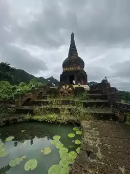 เราเลือกเดินขึ้นแค่ส่วนที่เตี้ยสุด (เพราะอันสูงสุดนี่ต้องสายลุยจริงๆ 😅) แต่แค่นี้ก็คุ้มแล้ว เพราะได้เห็นเจดีย์ “พุทธคีรีศวรรย์” อยู่ท่ามกลางธรรมชาติแบบใกล้ชิด น้ำในบ่อมีดอกบัวเล็กๆ บานอยู่ ดูสงบและงดงามมาก 🌸