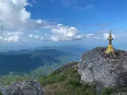 This is the farthest viewpoint on Khao Luang Mountain from the campsite, a 2.2-kilometer hike. The trail features steep, flat trails, and a cliffside walk. It's the highest peak in Khao Luang Sukhothai, offering stunning 360-degree views of the surrounding mountains and forest. A small golden chedi stands atop the rocky outcrop, creating a stunning contrast against the lush green forest. This is also a great spot to watch the sunset, offering a peaceful atmosphere. It's not very popular due to the relatively long walk.