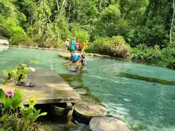 🏞️ Atmosphere: Ban Nam Rat has a quiet and shady atmosphere. There are green trees surrounding the spring water. The water in the pond is emerald blue and clear, allowing you to clearly see the sand below. There is also a long stone path through the pond for soaking your feet, playing in the water, or taking beautiful photos.